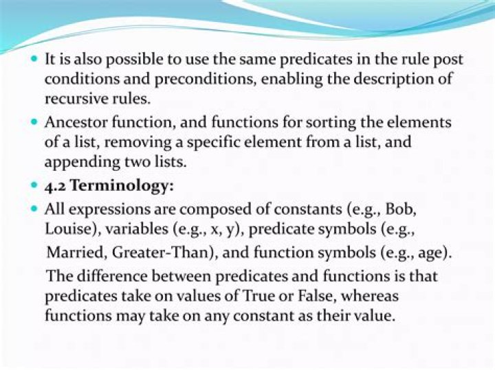 Functions are different from predicates in the sense that they take objects and return objects. An example of function is the sum of two numbers.