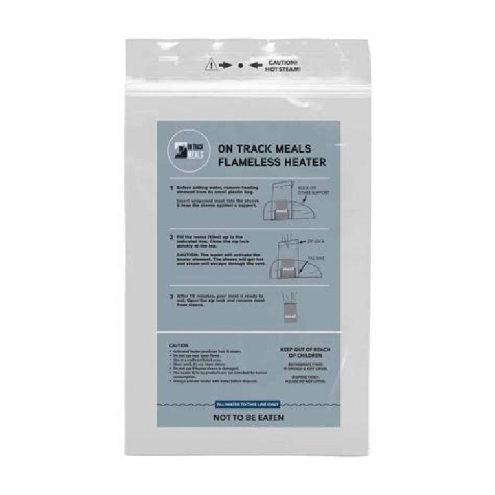 Simply cut open the top of the FRH polybag sleeve, Place the MRE food portion inside the bag next to the heater. Add plain water to the “Fill Line”, and fold the open end of the bag. In just 12 minutes – enjoy a hot meal anytime, anyplace.