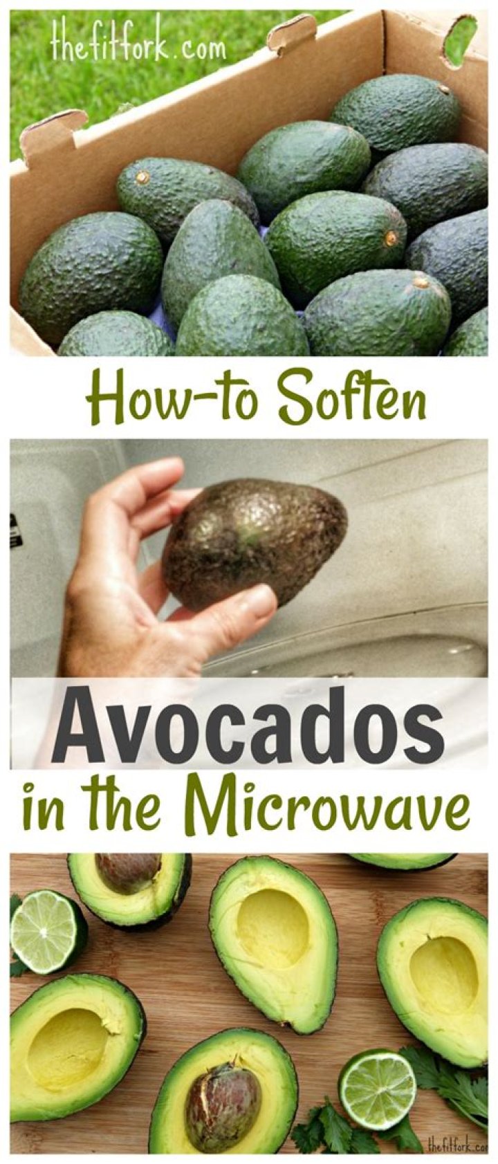 How to ripen avocados in the microwave: Cut the avocado in half and remove the pit then wrap each half in plastic wrap. Microwave on HIGH for two minutes then run the wrapped avocados under cold water to stop cooking.