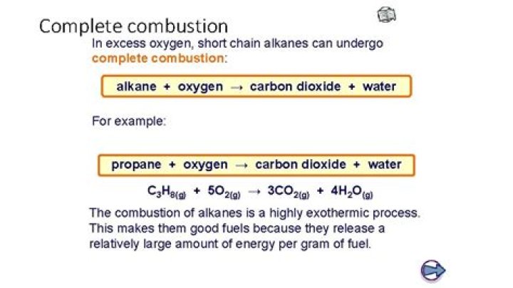 It is the process of burning the alkane in the presence of sufficient air or oxygen; it produces carbon dioxide, water, and a huge amount of heat as a product.