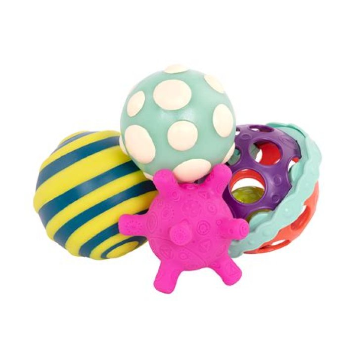 - Things they can reach for, hold, suck on, shake, make noise with—rattles, large rings, squeeze toys, teething toys, soft dolls, textured balls, and vinyl and board books.