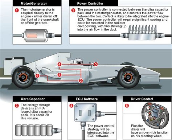 With KERS, that energy is not lost but stored somewhere to be used to drive the car – that somewhere could be in a battery (chemical energy) in a flywheel (mechanical), in an accumulator (hydraulic) and in many others ways too.