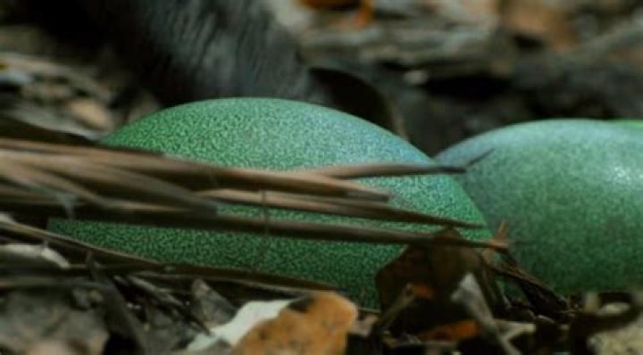 The female lays three to six green eggs, each of which is about 13 cm (5 inches) long and weighs 650 grams (23 ounces). The male incubates those for about 50 days in a leafy nest on the ground and may provide most of the early care of the striped young. Cassowaries forage for fruits and small animals.