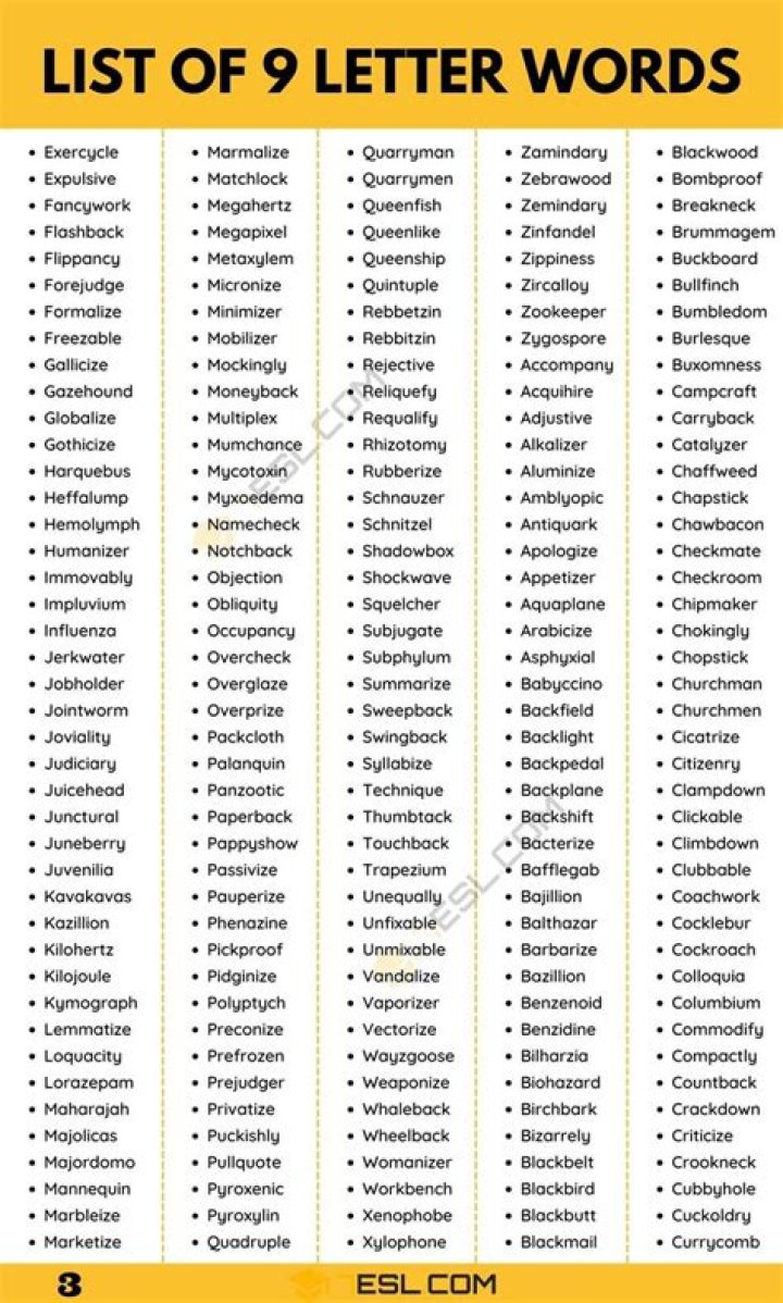 Of the almost 41,000 words by the length of nine letters, some of the most well-known include ABHORRENT, ABILITIES, ABRASIONS, ACQUITTED, ADULTHOOD, BASEBOARDS, BLEACHERS, DRIZZLING, EMBEZZLES, EXPERTISE, HIJACKERS, LIFEHACKS, NEWLYWEDS, ORTHODOXY, PARALYZED, RECOGNIZE, REFLEXIVE, TECHNIQUE, TEXTBOOK, UNPLUGGED, ...