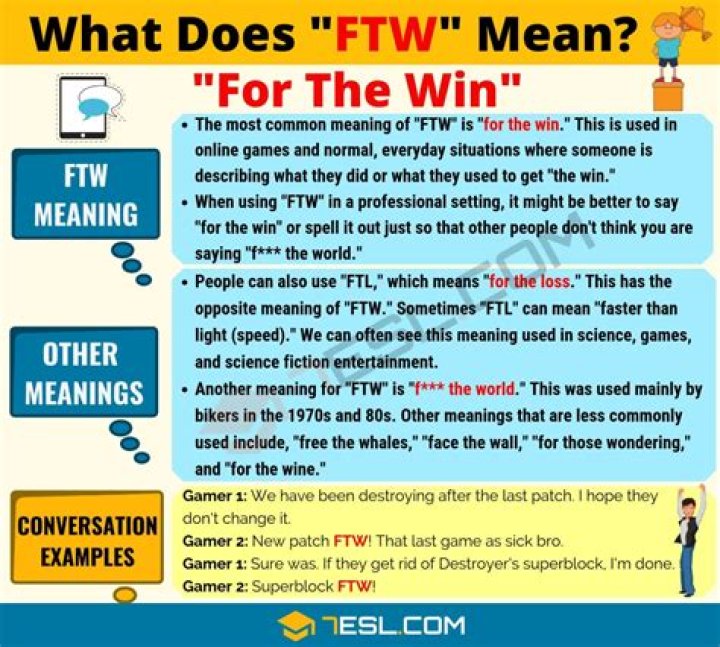 FTW means "for the win," an internet cheer used to express enthusiasm about an achievement. It's frequently used in online forums, text message conversations, and email. FTW can be used in place of "epic win" and other expressions of victory.