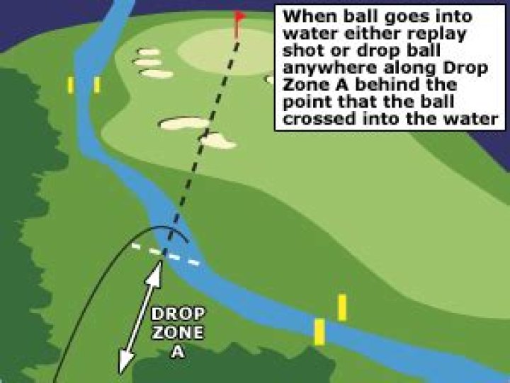 What is this? The most likely thing you will do, if your ball goes into a water hazard is take a drop. Keeping the point that the ball last crossed the margin of the hazard (the yellow line) between you and the hole, you may proceed backward as far as you like and take a drop.