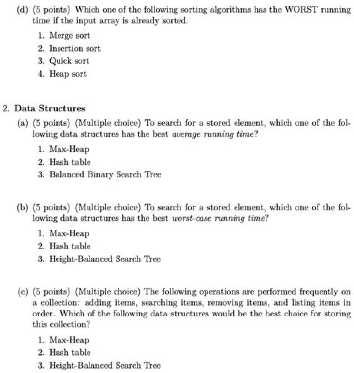3. Which of the following sorting algorithms does not have a worst case running time of O(n2 )? Insertion, Quick and bubble all have worst case time complexity of O(n2). Only merge sort has the worst case running time of O(nlogn).