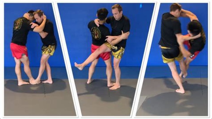 After you have caught your opponent's leg, keep holding the leg and come in for a knee strike. Following the knee strike, grab the back of your opponent's head and sweep them off balance.