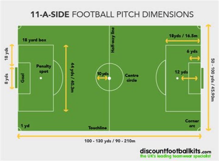 The length of a pitch must be between 100 yards (90m) and 130 yards (120m) and the width not less than 50 yards (45m) and not more than 100 yards (90m).