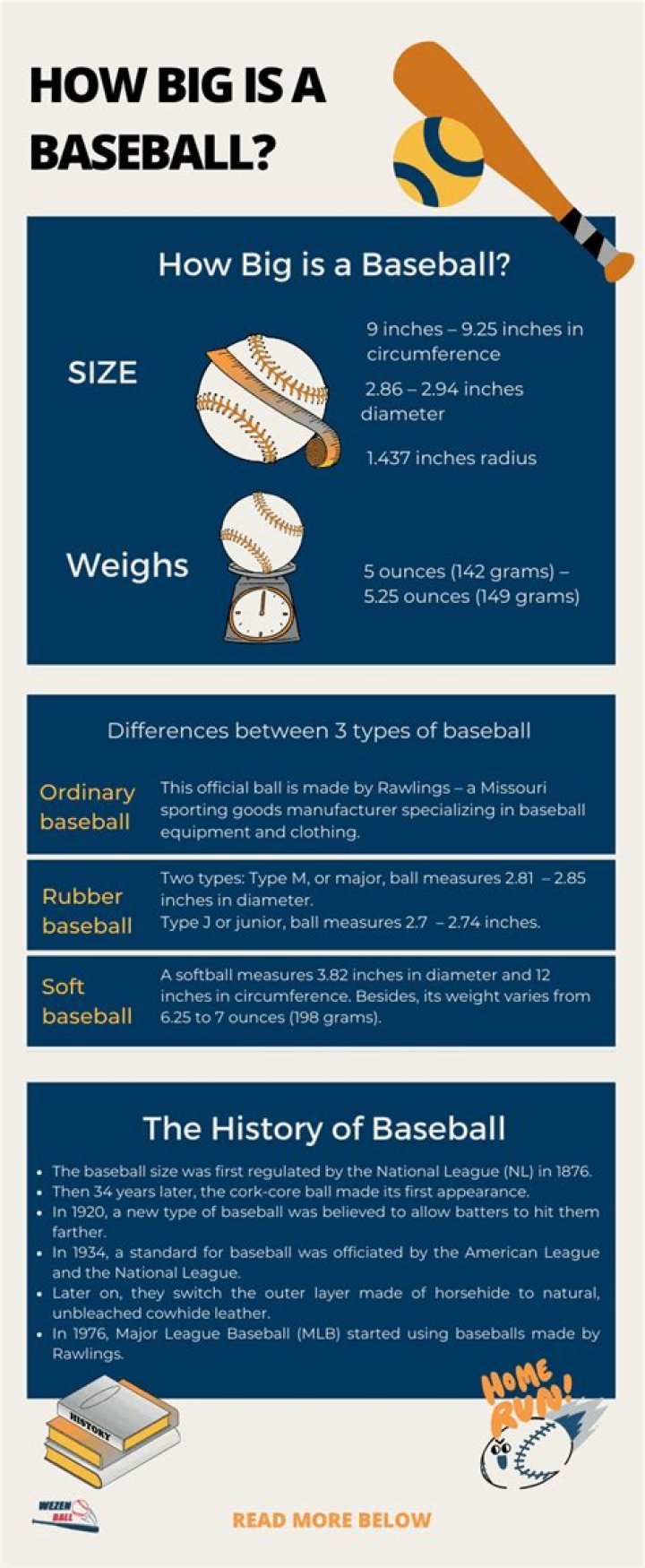 A regulation baseball is 9 to 91⁄4 inches (229 to 235 mm) in circumference (just slightly under 3 inches or 7.5 cm in diameter), with a weight of 5 to 51⁄4 oz. (142 to 149 g). A baseball is bound together by 108 hand-woven stitches through the cowhide leather.