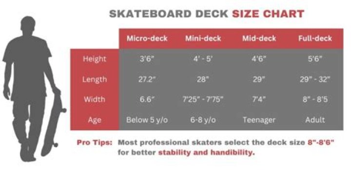 Mini decks are the best skateboards for beginners who are 6-8 years old, between 3'5” and 4'4” tall who wear size 4-6 shoes. For skaters 9 to 12 years old between 4'5” and 5'2” tall who wear size 7-8 shoes. This is a good skateboard for all skaters over age 13, taller than 5'3” with a shoe size of 9 and up.
