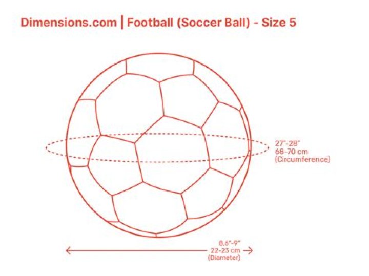 The size of a football is roughly 22 cm (8.66 inches) in diameter for a regulation size 5 ball. Rules state that a size 5 ball must be 68 to 70 cm (27 to 28 in) in circumference. Averaging that to 69 cm (27 in) and then dividing by π gives about 22 cm (8.7 in) for a diameter.