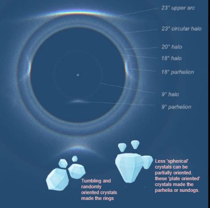 Halos. Ice crystal halos include a variety of circles, arcs, and spots of light that occur when sunlight strikes ice crystals. Photographs of halo displays at the South Pole (see Figure 7) have made it common knowledge that there are a plethora of different halos.