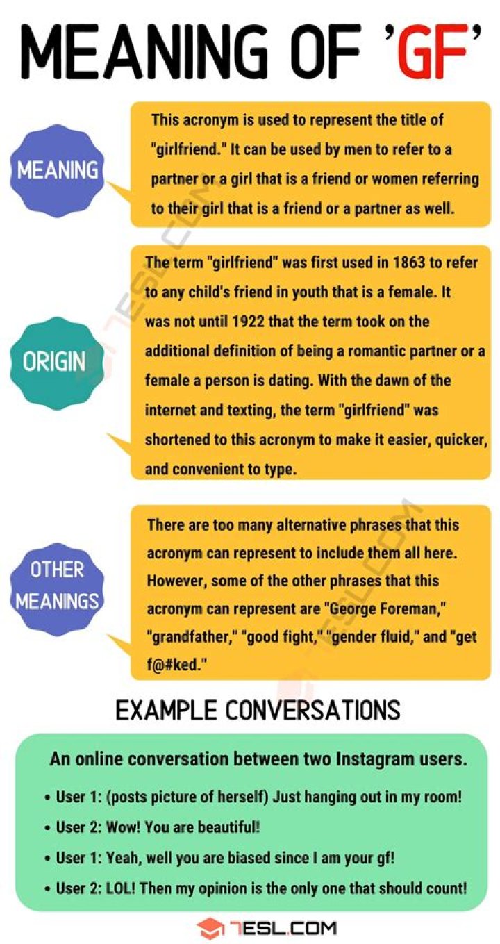 You've likely encountered the acronym GF while texting, searching the internet or even in conversation. GF typically means “Girlfriend.” Although it is usually used in written form, it can be used in everyday speech.