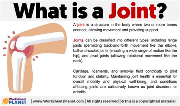 A joint is the part of the body where two or more bones meet to allow movement. Generally speaking, the greater the range of movement, the higher the risk of injury because the strength of the joint is reduced. The six types of freely movable joint include ball and socket, saddle, hinge, condyloid, pivot and gliding.