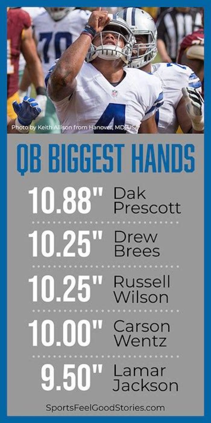 Drew Brees has a recorded height of 6 feet, while his hand size is 10.25 inches. Russell Wilson has a larger hand ratio as he is only 5 feet 11 inches tall, and his hands measured 10.25 inches too. Brett Favre is also a testament to how important it is to have a large hand size for an NFL quarterback.