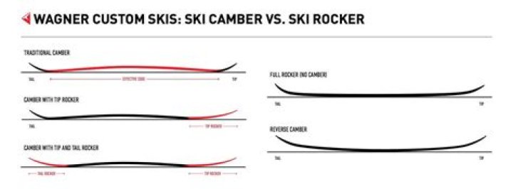 A rocker or reverse-camber, is literally a camber turned upside down. So the ski touches all the way down the middle then parts early at the tip (and sometimes the tail). These are great for beginners and advanced riders, the rise of the tip and tail away from the snow means easier float in deeper powder.