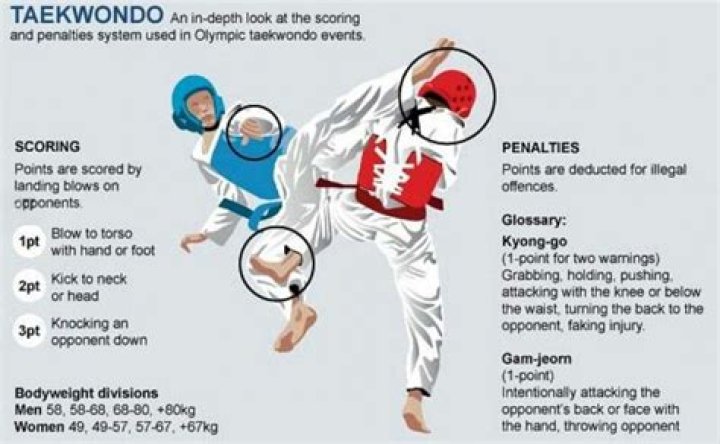 Punches to the body are allowed, but not to the head. A match consists of three two-minute rounds and will go into a "golden point" round if the score is tied at the end of three rounds. At that point, the first fighter to score — with any technique — wins. Here's a quick guide to taekwondo scoring.