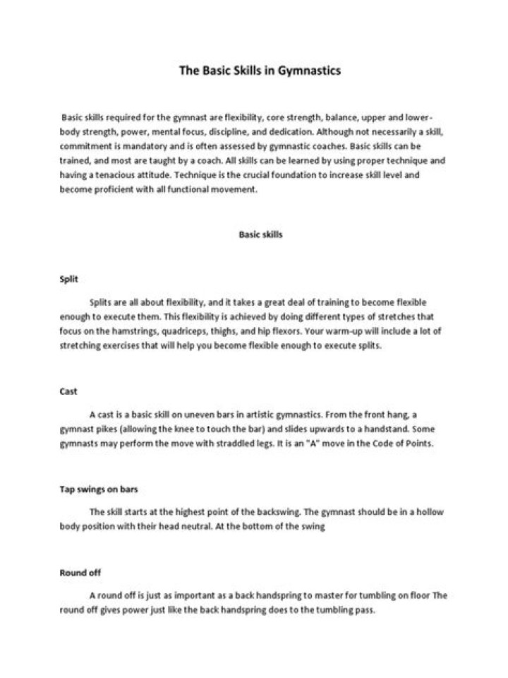 Basic skills required for the gymnast are flexibility, core strength, balance, upper and lower-body strength, power, mental focus, discipline, and dedication. Although not necessarily a skill, commitment is mandatory and is often assessed by gymnastic coaches.