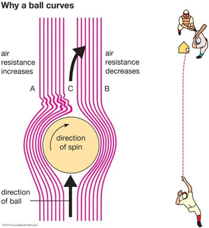 Curveballs curve — or break downward — because of the spin imparted by the pitcher as he flings it toward home plate. The way Briggs explained it, the rotation of the seams creates a "whirlpool" of air around the ball and causes the pressure to be lower on one side.