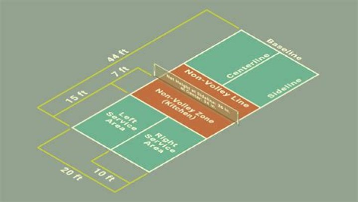 A pickleball court is 44 feet deep from the back of each baseline (2 inch wide lines) and 20 feet wide. The no volley zone or kitchen is 7 feet (back of the line) from the center of the net.