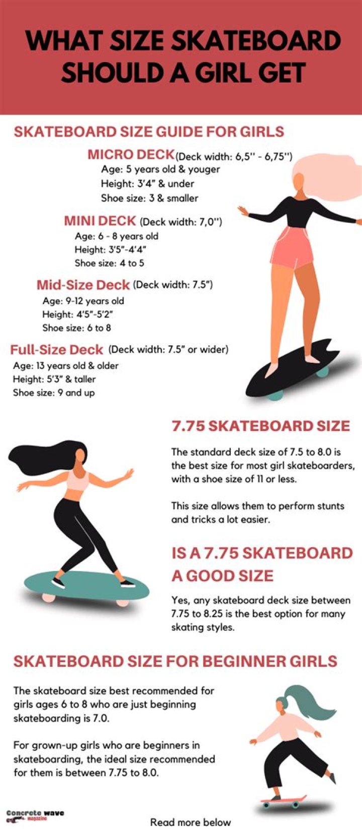 What size skateboard is the best for the beginner girls? 7.5 to 8.0 inches is the best for the beginner girls. It depends on the height, weight, and shoe size of the skater.