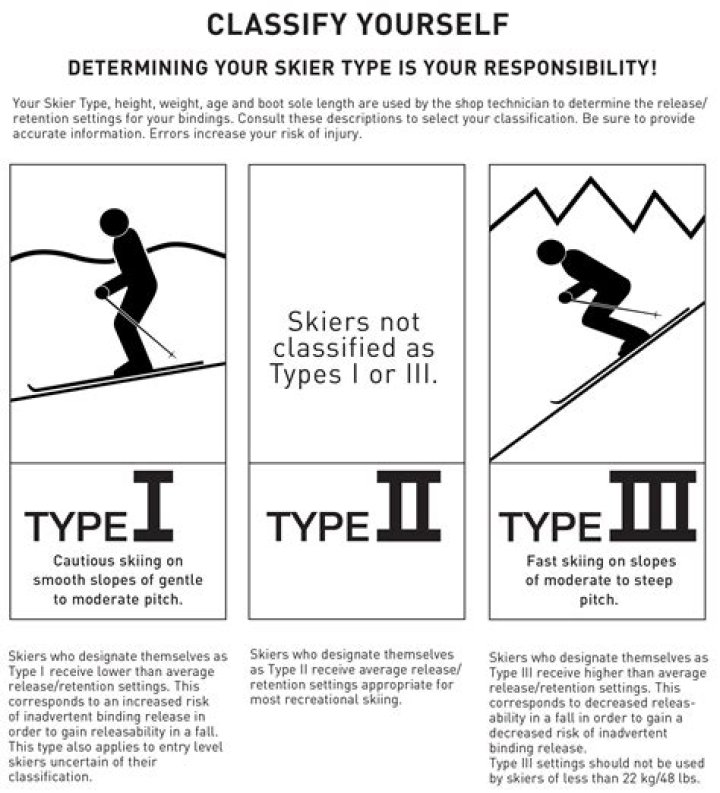 Skiers who designate themselves as Type II receive average release/retention settings appropriate for most recreational skiing. Skiers who prefer fast skiing on slopes of moderate to steep pitch. Skiers who designate themselves as Type III receive higher than average release/retention settings.