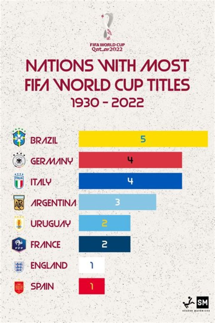 With five titles, Brazil is the most successful World Cup team and also the only nation to have participated in every World Cup finals tournament. Italy and Germany have four titles. Current champion France, along with past champions Uruguay and Argentina, have two titles each, while England and Spain have one each.