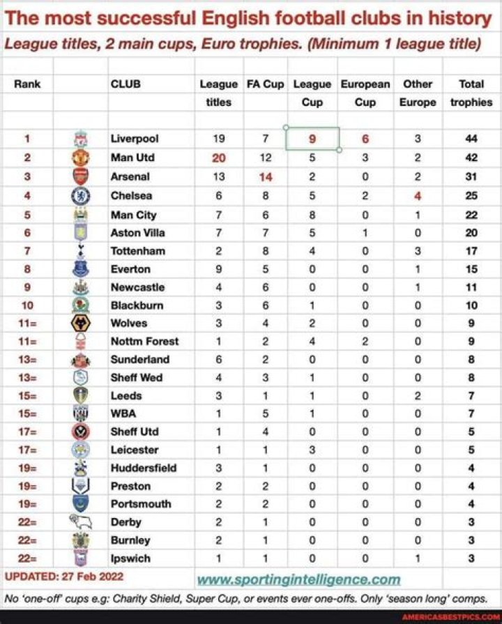 Liverpool are the most successful English team internationally with fourteen honours.