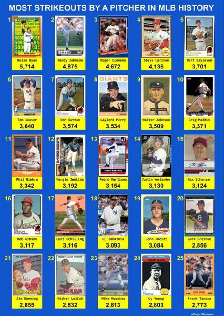 Nolan Ryan has the most career strikeouts in Major League Baseball. During a record 27-year career, he struck out 5,714 batters. The American League record is held by Roger Clemens (4,167 strikeouts), while in the National League, the record is 4,000 by Steve Carlton.