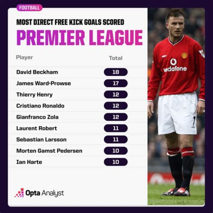 Manchester United legend David Beckham leads the way, and by a margin too, with 18 goals scored directly from free-kicks. Thierry Henry and Gianfranco Zola are joint-second on the list with the two forwards hitting 12 for Arsenal and Chelsea respectively.
